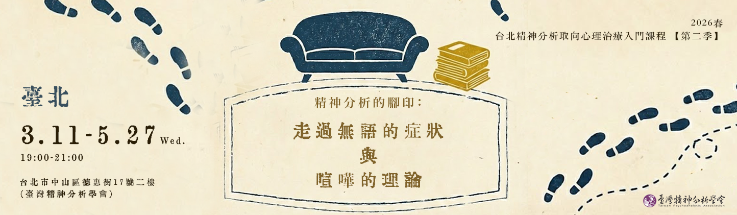 臺灣精神分析學會自2005年起在週三晚上舉辦入門課程已超過十年,目前分別於《台北》、《台中》、《台南》和《高雄》舉辦,每年春季(3月)與秋季(9月)開課,每季十二堂課(週三晚上進行二小時)。有系統地介紹精神分析以及分析取向心理治療的基本概念、當代理論、以及臨床實務操作的反思,為入門者提供一個清楚而全面的介紹,適合對精神分析有興趣的一般民眾或專業人員參加。