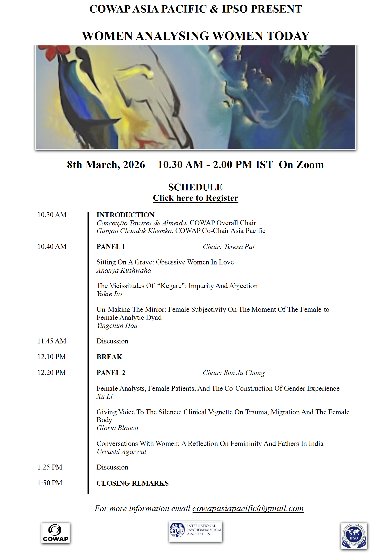 國際精神分析學會的「精神分析與女性」委員會(COWAP) 與「國際精神分析學生組織」 (IPSO) 即將於 2026/3/8 婦女節,合辦一場線上會議,題目為:今日的女性分析女性 (Women analysing women today)。